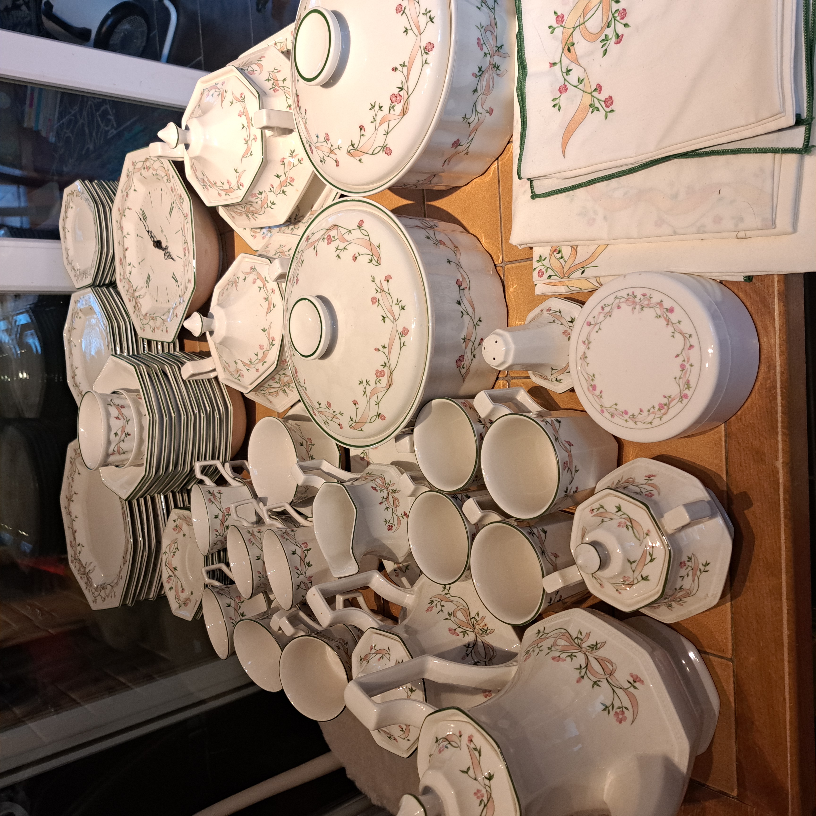 compl, eternel beau par johnson brothers, 12 assiettes gdes, moy, pttes, tasses et ss tasses, etc