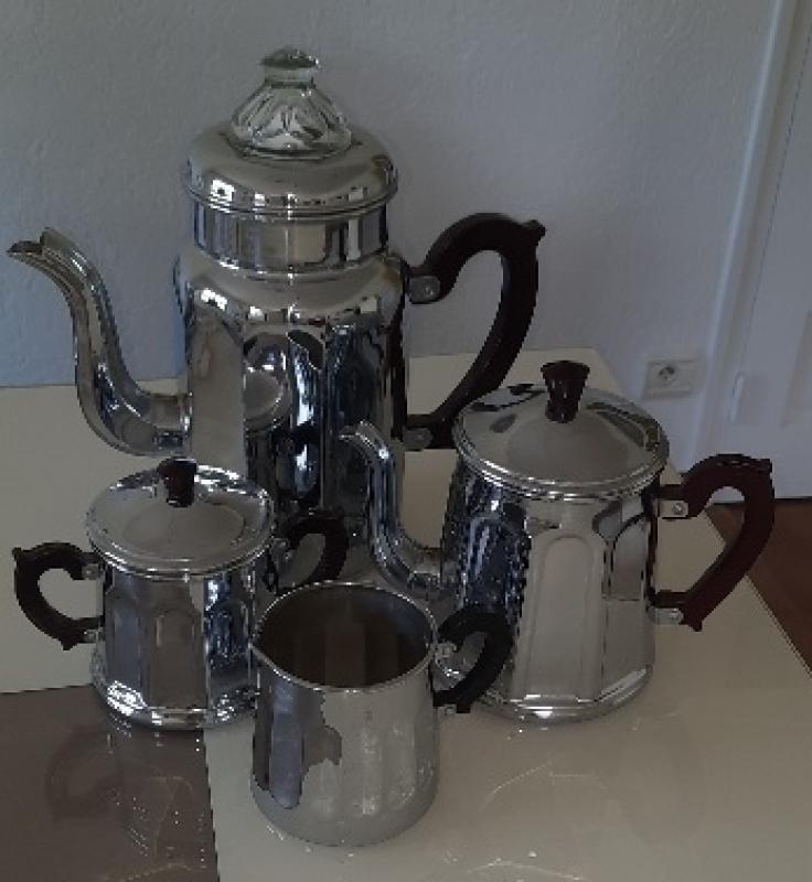 théière, complète, h 28 cm + sucrier pot à lait, cuivre chromé, année 50 + bonbonnières/sucriers, verre + vaisselle très ancienne, terre d'acier ste uze + service café/dessert (ph)